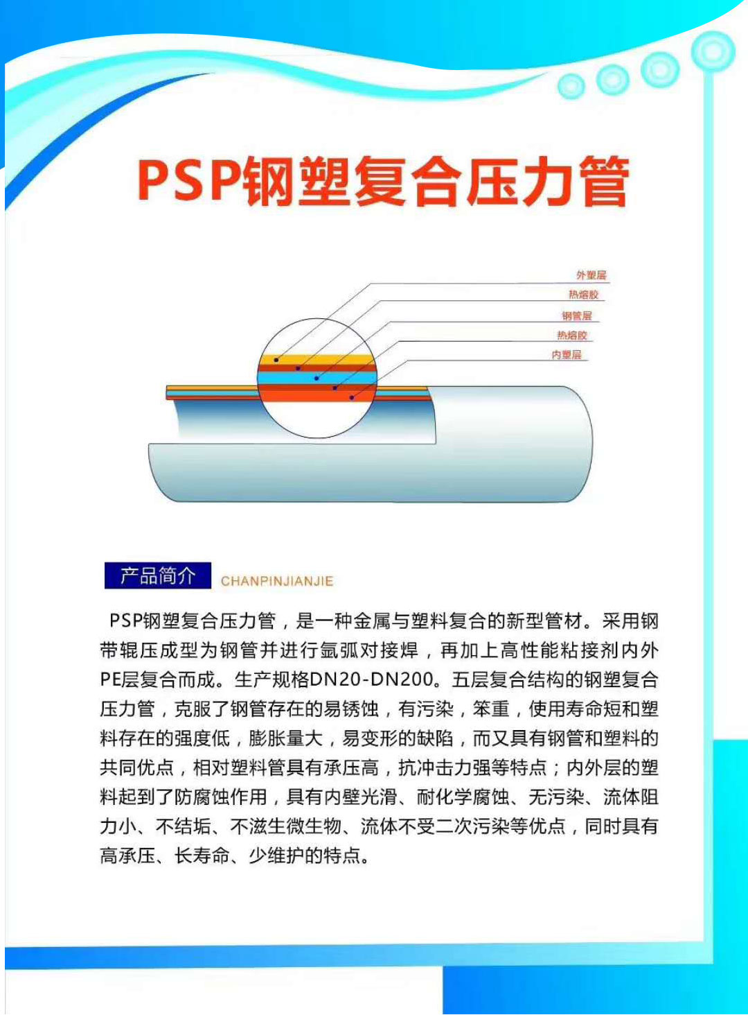 产品名称:PSP钢塑复合管 产品类别:工程项目系列>>PSP钢塑复合管 咨询电话: 022-27644893 技术参数: